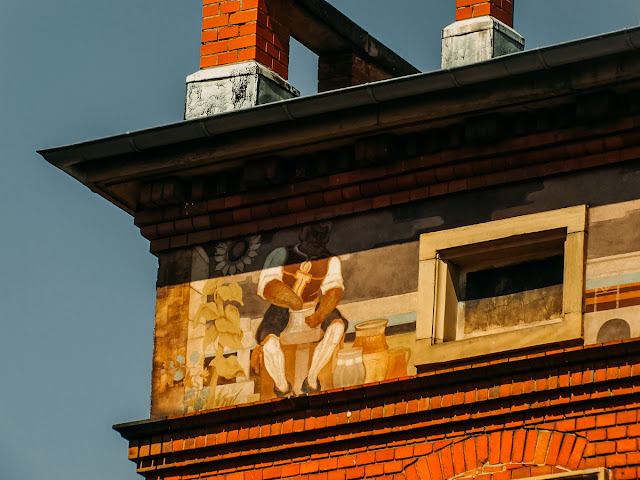 i wonder what the story about this house was, and why it ended up with a depiction of a time that did not belong to its construction date? depicted were scenes of a factory worker toiling away...
