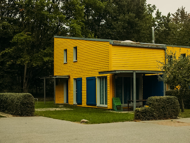 a bit further into the former resort we found a pretty contemporary holiday home area with about 30 wood-clad bungalows next to each other. they were all very colourful ( boasting bauhaus primary colours ;P ) and also kinda cute. i really like tiny homes, but i think i could do without all the close neighbours around 😅